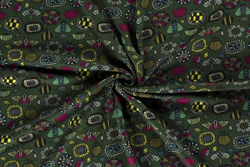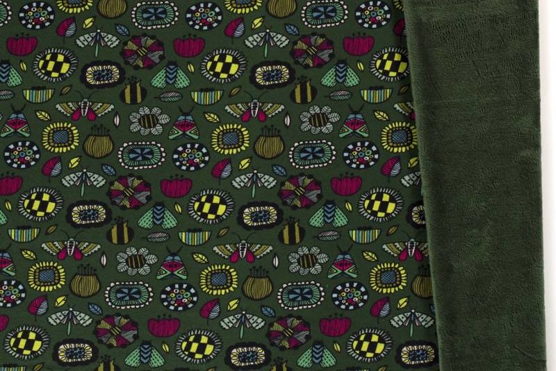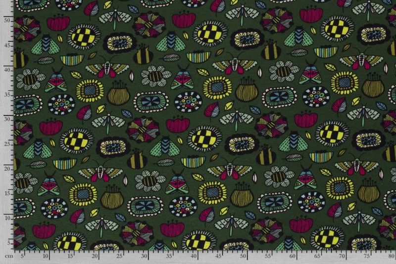 Wellness jogging, vrolijke bloemen en insecten print, donkergroen/lime/roze. Q2732